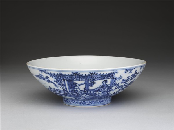 侈口,淺壁,矮圈足。外面畫亭園景物,仕女水榭納涼圖。足圈畫勾雲紋一周。口足加飾青線六線。內面純白,樸素無紋飾。底有青花書「大明宣德年製」六楷字款,外加雙圈。