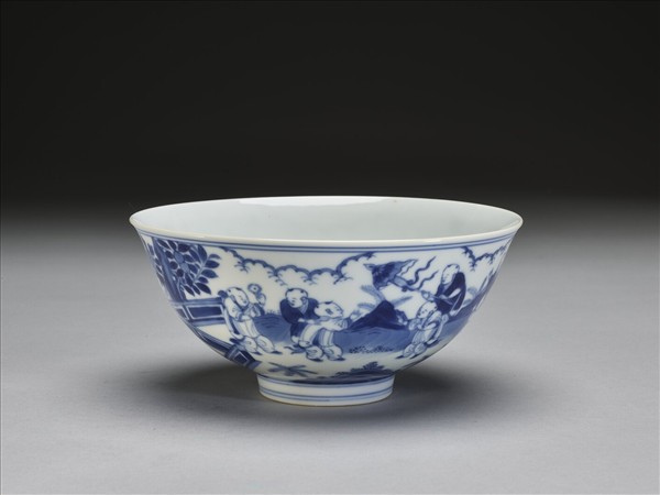 侈口,深壁,圈足。以釉下青花繪飾。碗內素白無紋,碗外壁繪夏日庭院嬰戲圖,襯以圍欄、樹石、花卉。十四孩童分隔成二組畫面,一組穿肚兜赤膊,一組穿衫褲。口足加飾青線六道。底青花書「大明成化年製」雙圈六字楷款。