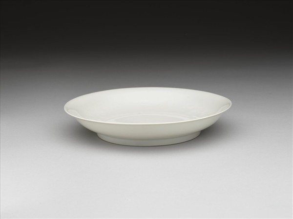 侈口窄唇,淺壁,矮圈足。內壁錐拱雲龍二條,盤心淺劃雲紋,外壁無紋飾。半脫胎,釉色甜白。