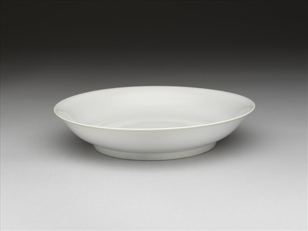 侈口窄唇,淺壁,矮圈足。內壁錐拱雲龍二條,盤心淺劃雲紋,外壁無紋飾。半脫胎,釉色甜白。