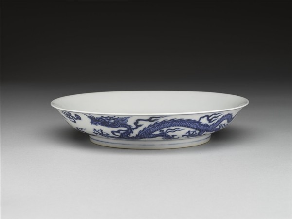 侈口窄唇,淺壁,矮圈足。胎骨較薄。外壁畫雙龍戲珠,隙地加飾朵雲,口足飾青線三道。內壁純白釉,錐拱雙雲龍,盤心淺劃雲紋。