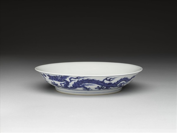 侈口窄唇,淺壁,矮圈足。胎骨較薄。外壁畫雙龍戲珠,隙地加飾朵雲,口足飾青線三道。內壁純白釉,錐拱雙雲龍,盤心淺劃雲紋。