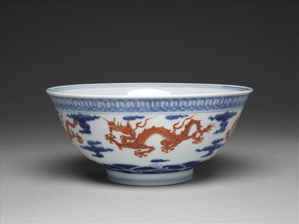 侈口,深壁,圈足。外壁飾紅彩四龍紋與青花十字雲紋,口沿與足圈分繪鎖子紋與波濤紋一周。內壁純白,碗心飾紅彩龍紋與青花雲紋,外加雙圈。底有青花書「大明宣德年製」六楷字款,外加雙圈。