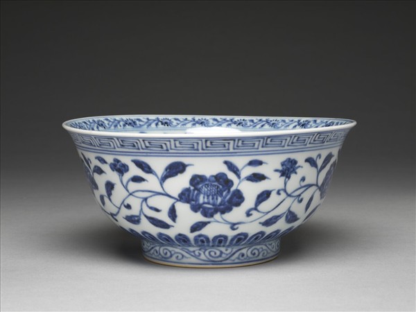 侈口窄唇,深壁,矮圈足。碗內口沿畫青花轉枝菊花一周,碗內底畫番蓮一枝,內壁畫青花纏枝牡丹、菊花等四季花卉五朵,外壁亦畫四季花卉五朵;外口沿畫回紋一周,底邊畫蓮瓣紋,足圈有卷草紋。各紋飾間有青花弦紋相區隔。足圈露胎,圈足內底施白釉,並書「大明宣德年製」六字雙行雙圈青花楷書。