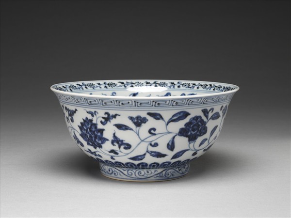 侈口窄唇,深壁,矮圈足。碗內口沿畫青花轉枝菊花一周,碗內底畫番蓮一枝,內壁畫青花纏枝牡丹、菊花等四季花卉五朵,外壁亦畫四季花卉五朵;外口沿畫回紋一周,底邊畫蓮瓣紋,足圈有卷草紋。各紋飾間有青花弦紋相區隔。足圈露胎,圈足內底施白釉,並書「大明宣德年製」六字雙行雙圈青花楷書。