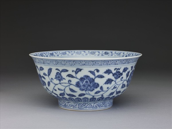 侈口窄唇,深壁,矮圈足。碗內口沿畫青花轉枝菊花一周,碗內底畫番蓮一枝,內壁畫青花纏枝牡丹、菊花等四季花卉五朵,外壁亦畫四季花卉五朵;外口沿畫回紋一周,底邊畫蓮瓣紋,足圈有卷草紋。各紋飾間有青花弦紋相區隔。足圈露胎,圈足內底施白釉,並書「大明宣德年製」六字雙行雙圈青花楷書。