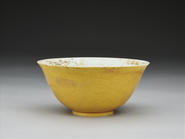 侈口微撇,深弧壁,矮圈足。全器外壁施淺黃釉,刻劃雙龍戲珠,圈足旁飾海水江牙,內壁施白釉。足底露胎,圈足內底施白釉青花「大清道光年製」篆款。