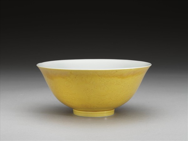 侈口微撇,深弧壁,矮圈足。全器外壁施淺黃釉,刻劃雙龍戲珠,圈足旁飾海水江牙,內壁施白釉。足底露胎,圈足內底施白釉青花「大清道光年製」篆款。