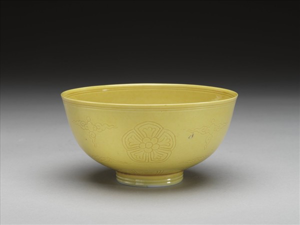 斂口,深壁,矮圈足。全器內外壁均施黃釉,釉色濃艷明亮。外壁刻劃四朵圖案花卉與雲紋,底邊飾變形蕉葉紋,口沿與圈足各飾弦紋二道。碗心刻劃圖案花一朵,外加雙圈。足圈露胎,圈足內底施白釉,並書「大清道光年製」篆款。