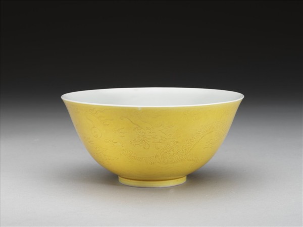 侈口微撇,深弧壁,矮圈足。全器外壁施淺黃釉,刻劃雙龍戲珠,圈足旁飾海水江牙,內壁施白釉。足底露胎,圈足內底施白釉青花「大清道光年製」篆款。