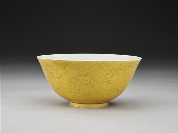 侈口微撇,深弧壁,矮圈足。全器外壁施淺黃釉,刻劃雙龍戲珠,圈足旁飾海水江牙,內壁施白釉。足底露胎,圈足內底施白釉青花「大清道光年製」篆款。