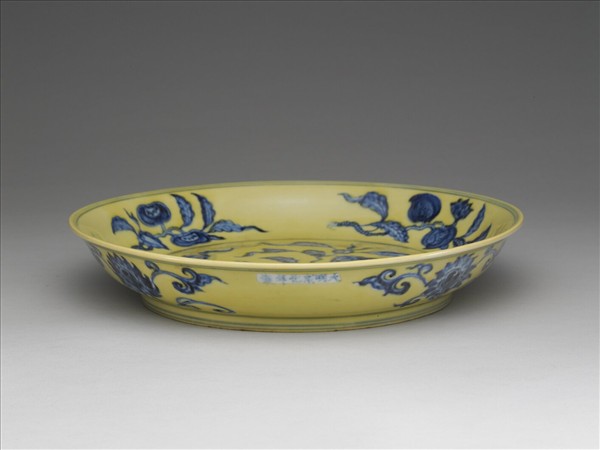 侈口窄唇,淺壁,矮圈足。內壁畫荔枝、枇杷等四種果實,盤心畫石榴花一枝,外壁畫番蓮花四朵。內外分畫青線十道。原為白地青花,加施黃釉一層,盤底全部露胎。外壁口沿下橫書青花「大明成化年製」六字楷款。