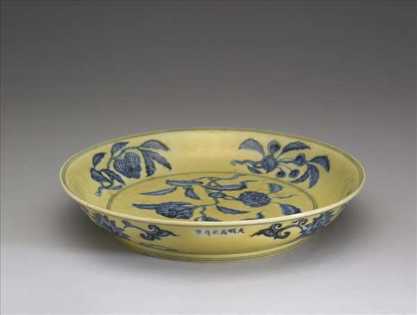 侈口窄唇,淺壁,矮圈足。內壁畫荔枝、枇杷等四種果實,盤心畫石榴花一枝,外壁畫番蓮花四朵。內外分畫青線十道。原為白地青花,加施黃釉一層,盤底全部露胎。外壁口沿下橫書青花「大明成化年製」六字楷款。