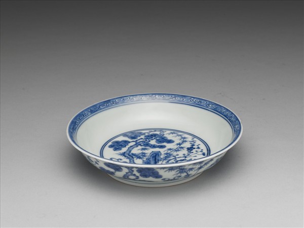 侈口窄唇,淺壁,圈足,圈足內壁泛淺褐色。盤外壁青花繪二組松、竹、梅等歲寒三友及湖石、靈芝。盤內口緣一圈卷草紋,盤心繪松、竹、梅與湖石、靈芝。內外共飾青線八道,青花釉色青中泛灰。底青花書「大明成化年製」雙圈六字楷款。