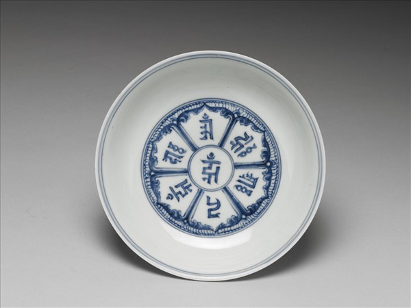 侈口窄唇,淺壁,圈足。以釉下青花繪飾。盤外壁書二層梵文。內壁無紋,盤心畫六瓣蓮花紋,花瓣及圓心內各書一梵字。底青花書「大明成化年製」雙圈六字楷款。