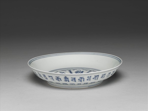 侈口盤,窄唇,淺壁,圈足。以釉下青花繪飾。盤外壁書二層梵文。內壁無紋,盤心畫六瓣蓮花紋,花瓣及圓心內各書一梵字。底青花書「大明成化年製」雙圈六字楷款。