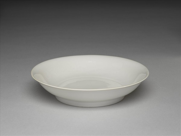 均侈口窄唇,淺壁,矮圈足。內壁錐拱雲龍二條,碟心淺劃朵雲。胎骨極薄,釉色甜白。