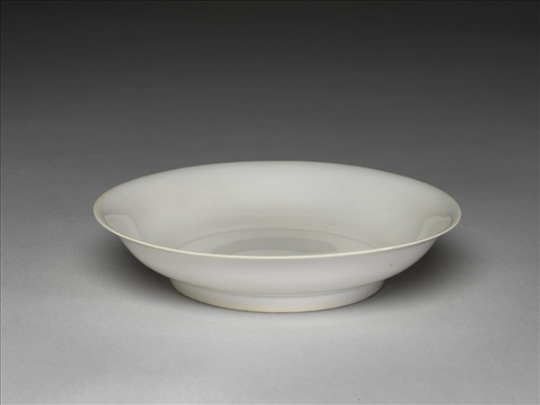 均侈口窄唇,淺壁,矮圈足。內壁錐拱雲龍二條,碟心淺劃朵雲。胎骨極薄,釉色甜白。