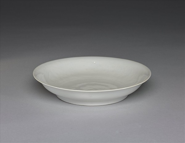 均侈口窄唇,淺壁,矮圈足。內壁錐拱雲龍二條,盤心淺劃雲紋,外壁無紋飾。半脫胎,釉色甜白。