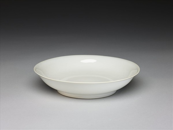 侈口窄唇,淺壁,矮圈足。內壁錐拱鳳凰一對,間飾朵雲,盤心淺劃雲紋,外面樸素無紋飾。薄胎骨,釉色甜白。
