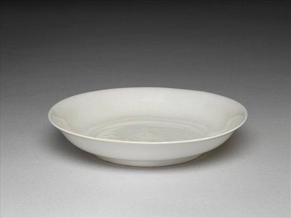 侈口窄唇,淺壁,矮圈足。內壁錐拱轉枝番蓮花,上托八寶,盤心錐拱法輪圖案。半脫胎,甜白色釉。