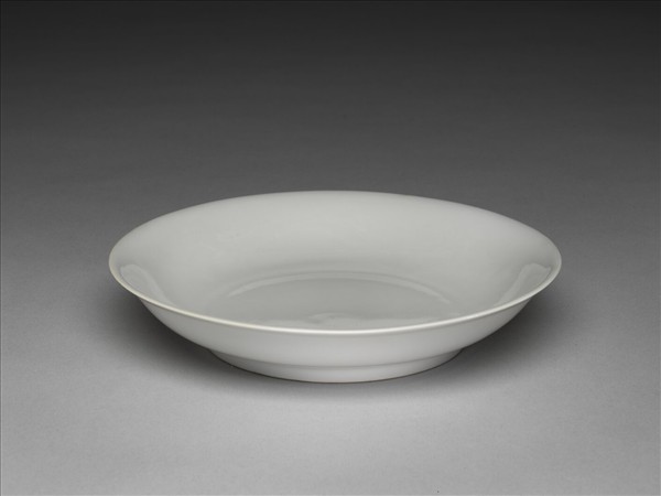 均侈口窄唇,淺壁,矮圈足。內壁錐拱雲龍二條,盤心淺劃雲紋,外壁無紋飾。半脫胎,釉色甜白。