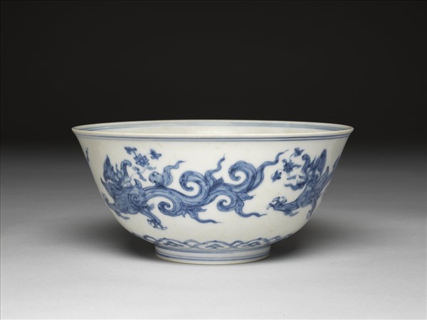 均侈口窄唇,深壁,矮圈足。薄胎白釉。外壁畫夔龍四隻,各銜蓮花一枝,底邊畫如意雲一周。碗心畫十字形圖案,內壁純白無紋飾。口足內外分飾青線十道。