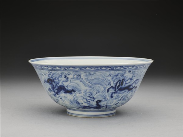 均侈口窄唇,深壁,矮圈足。外壁畫青花海獸九隻,隙地滿畫波濤紋,口沿下畫勾雲紋一周。碗心畫海獸一隻,內壁純白無紋飾。口足內外分飾青線。