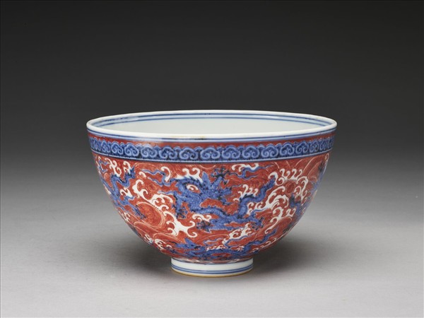 圓口微侈,深壁,尖底,矮圈足,通稱蓮子碗。薄胎白釉,碗心與外壁分畫青龍十條,隙地畫礬紅波濤紋,外面口緣下畫如意雲一周,口、足內外分飾青線十道,內壁純白無紋飾。