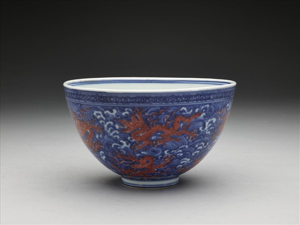 圓口微侈,深壁,尖底,矮圈足。通稱蓮子碗。薄胎白釉,碗心與外壁分畫礬紅龍十條,隙地畫青波濤紋,外面口緣下畫青古錢紋一周,口、足內外分飾青線十道,內壁純白無紋飾。