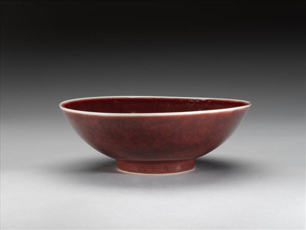 侈口,淺壁弧形,矮圈足。胎骨稍厚,內外滿施深紅釉。器底純白,口沿露白邊。