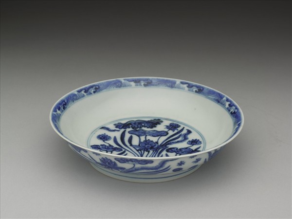 侈口窄唇,淺壁,矮圈足。口唇上畫波濤紋一周,盤心及外壁均畫蓮塘水藻,內外花紋間加飾青線七道。底有青花書「大明宣德年製」六楷字款,外加雙圈。