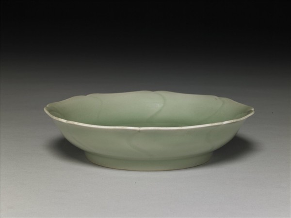 景德鎮自明初即仿龍泉釉色製器,永樂、宣德、成化均佳,通稱為冬青釉,有淺青色者如本件;有較偏綠者,具龍泉釉韻味,但質較輕而細緻。本器侈口、弧壁、圈足。葵花式口,並連延至內外壁劃刻曲線作花瓣狀。通體施青釉,釉薄,凹處色深,口沿泛白,足端無釉微現淺黃色。器底以青花於雙青圈內書「大明宣德年製」二行六字楷款。