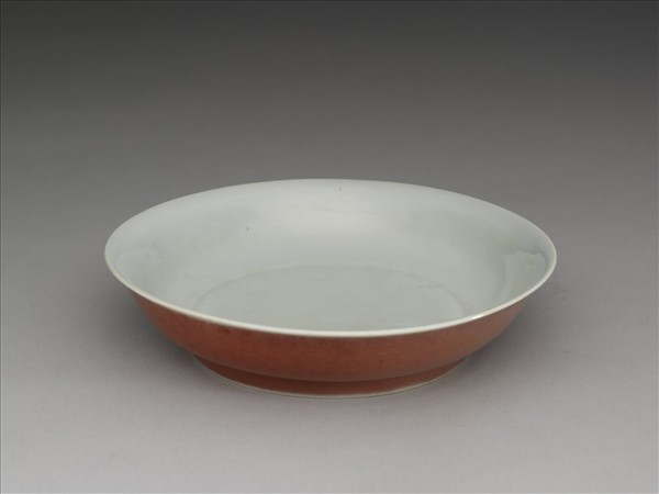 均侈口窄唇,淺壁,矮圈足。內壁錐拱雙龍戲珠紋,面施白釉。外面釉色鮮紅,樸素無紋飾。底均劃有「大明宣德年製」六楷字暗款,外加雙圈。