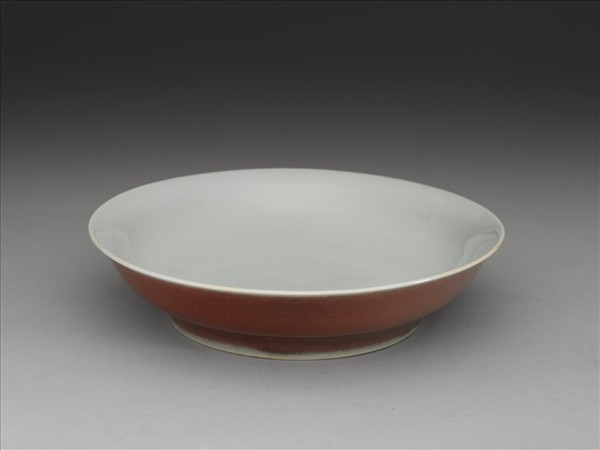 均侈口窄唇,淺壁,矮圈足。內壁錐拱雙龍戲珠紋,面施白釉。外面釉色鮮紅,樸素無紋飾。底均劃有「大明宣德年製」六楷字暗款,外加雙圈。