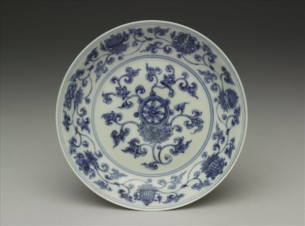 侈口窄唇,淺壁,圈足。以釉下青花繪飾。盤外壁六組團花番蓮紋,圈足壁飾六朵圖案小花紋。盤內壁七朵纏枝蓮各托八吉祥之一件,盤心為蓮托法輪。內外花紋間加飾青線十道。底青花書「大明成化年製」雙圈六字楷款。