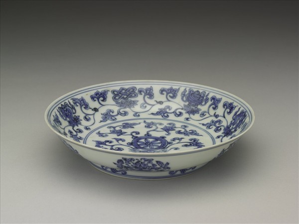 均侈口窄唇,淺壁,矮圈足。內壁及底心畫纏枝番蓮花,加飾八寶。外壁畫團花番蓮六朵,足畫梅花六朵。內外花紋間加飾青線十道。底均有青花書「大明成化年製」六楷字款,外加雙圈。