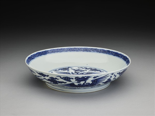 均侈口,淺壁弧形,矮圈足。器內口沿下畫勾雲紋一周,盤心與底各畫雲鳳一隻,外壁畫雲鳳三隻,口、足內外分飾青線。