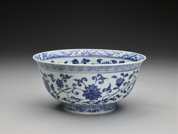 侈口窄唇,深壁,矮圈足。口唇上畫波濤紋,內壁畫纏枝牡丹、菊花,碗心畫番蓮一枝。外面口沿下畫回紋,周壁畫纏枝番蓮,底邊畫蓮瓣紋,足圈畫勾雲紋。口足內外分飾青線。