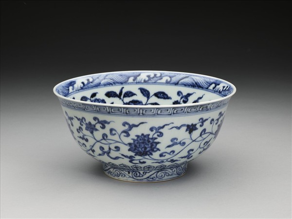 侈口窄唇,深壁,矮圈足。口唇上畫波濤紋,內壁畫纏枝牡丹、菊花,碗心畫番蓮一枝。外面口沿下畫回紋,周壁畫纏枝番蓮,底邊畫蓮瓣紋,足圈畫勾雲紋。口足內外分飾青線。