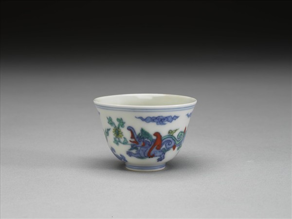 侈口窄唇,深壁,圈足。外壁繪夔龍二,各一口銜蓮花,姿態矯健,間飾青花朵雲。釉下青花輪廓線色淡,填染紅、綠、黃諸彩。口足分飾青線二道。內面素白無紋。底書青花「大明成化年製」雙方框六字楷款。