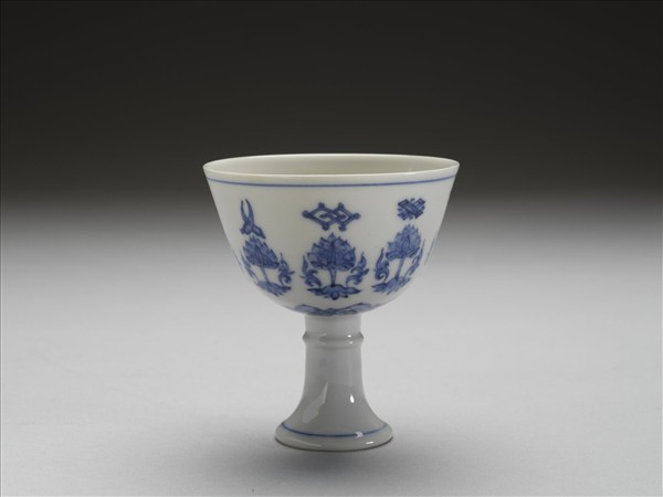 侈口,深壁,高圈足。以釉下青花繪飾。杯內素白,外壁畫青蓮花八朵,上飾八寶,底邊畫如意雲一圈,口足各飾青線一道。高足內空,於足內斜壁有青花書「大明成化年製」六字楷書橫款。