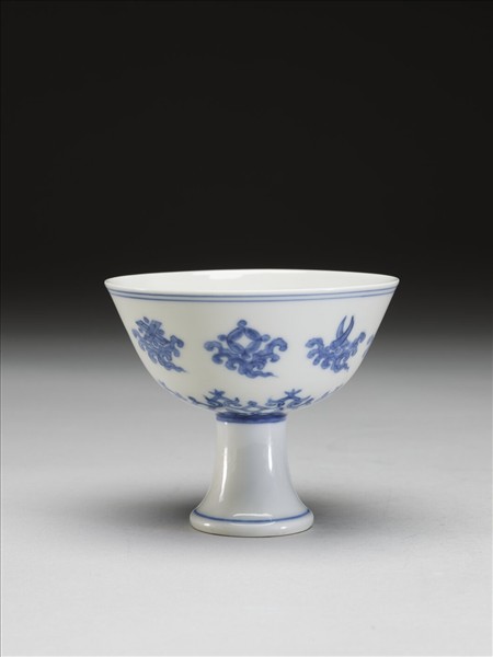 侈口,深壁,高圈足。以釉下青花繪飾。杯內無紋,杯外壁雲托八寶,杯肩繪圖案紋一圈。高足內空,於足內斜壁有青花書「大明成化年製」六字楷書橫款。