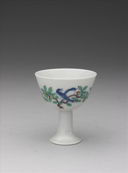 高足杯器表畫兩組果實禽鳥,一組白腹藍羽,齊望眼前佳景。一組褐腹藍羽,隔著綠葉喁喁對話。