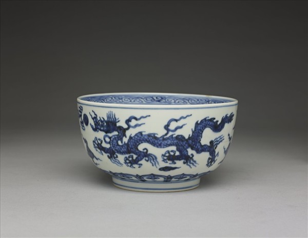 直口、深壁,帶直壁圈足碗,碗心雙圈內繪雲龍紋,口沿飾卷草紋。外壁則描繪雙龍戲珠紋。近足處描繪蓮瓣紋一周,足壁青線一道,足內「大明弘治年製」雙行六字楷書雙圈款。此器無論是龍身麟片、鬃毛、雲紋與火珠紋皆有樣式化的傾向,但亦屬明代中期官窯的風格範疇。