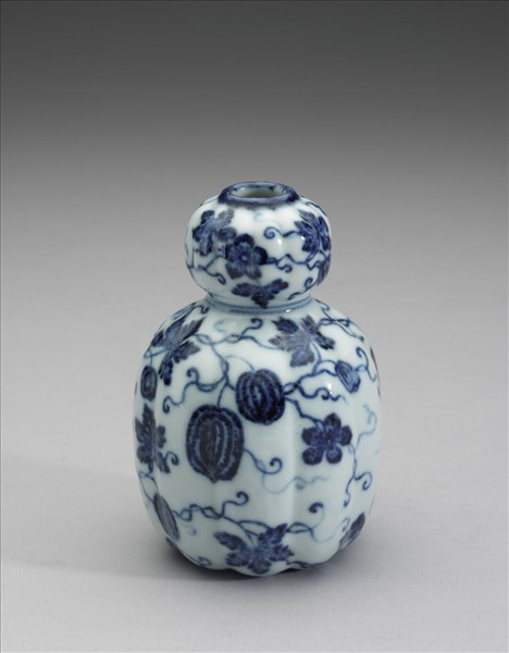 器形似葫蘆,大小二瓜相連,斂口小窄邊。薄胎白釉,器面滿畫青花纏枝大小瓜。