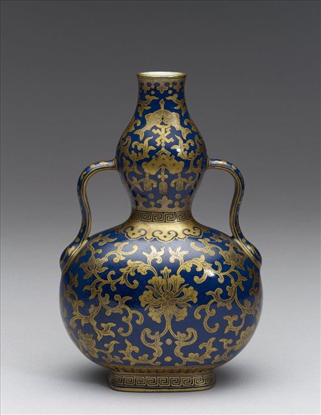 扁葫蘆形,飾有弓形雙耳。胎質稍厚,器面滿施深藍釉描金花。上截畫雙魚、萬字、懸磬,加飾桃花二枝。下截畫纏枝番蓮花。口、腰、足分飾回紋與如意雲等六道。兩耳各畫花朵。器內及底均施淺綠色釉。底有硃紅書「大清乾隆年製」六篆字款。