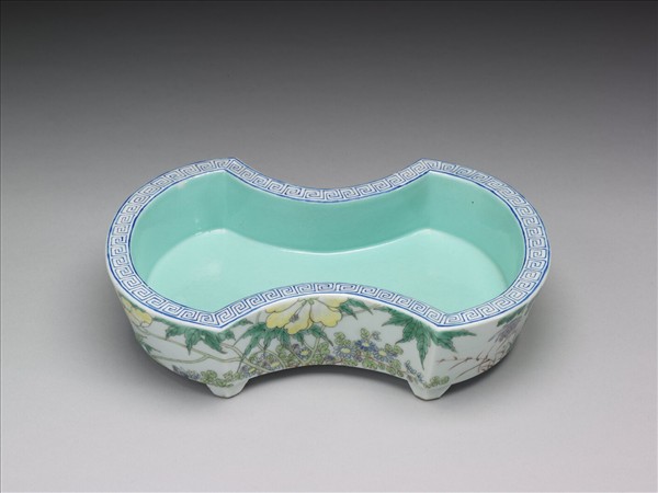 銀錠式花盆,直壁,平底,六雲頭足。器內湖綠釉,器表白地描黃花秋葵、紫紅菊各三朵,並有三隻蜜蜂忙於其間;留白處,紅彩「大雅齋」楷書及「天地一家春」閒章兩款。底書「永慶長春」四字朱書楷款,並遺細支釘痕兩圈。造型小巧,顏色柔美,紋飾充滿秋意。根據《同治十三年傳九江活計底單》記錄,大雅齋瓷器共有三十三種樣稿,每一種款式又燒製不同釉色的瓷器。本件作品的樣稿編號為「貳拾玖號」,同時訂製了粉地及藕色地各四對,共十六件。「天地一家春」一款取自圓明園內,后妃隨駕,駐蹕諸院落的總稱。蘭貴人葉赫那拉氏(慈禧太后)即在此受到咸豐皇帝(1831-1861)的榮寵。「長春宮」為紫禁城內的寢宮,同治元年(1862)起,慈禧太后便居此聽政。「永慶長春」是一幅掛於長春宮的匾額,「大雅齋」則是太后作畫的書房。據花盆上的名款,說明是慈禧太后訂製瓷,也代表太后的品味。咸豐年間圓明園遭英法聯軍燒毀,同治十二年(1873)太后策劃重修圓明圓,再造「天地一家春」,預計在四十大壽時遷入。同治十三年(1874)三月特別傳旨景德鎮,燒造這批瓷器,以妝點未來的新居。七月因財政等因素,修園計畫停止,此批瓷器至光緒二年(1876)才燒成解京。