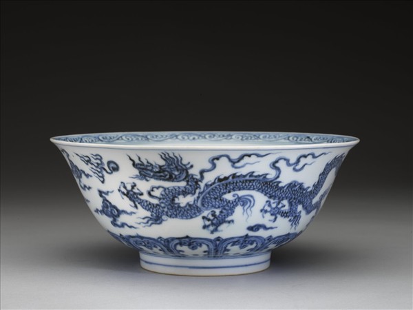 撇口,弧壁,矮圈足。碗內口沿飾卷草紋一周,內壁白釉上淺印暗花雙龍紋,碗心繪一折帶雲(又稱如意雲紋),外壁畫雙龍,底邊蓮瓣紋一周。青釉濃重帶灰,胎骨均勻,質堅細膩。底書「大明宣德年製」二行六字楷款,外加雙圈。