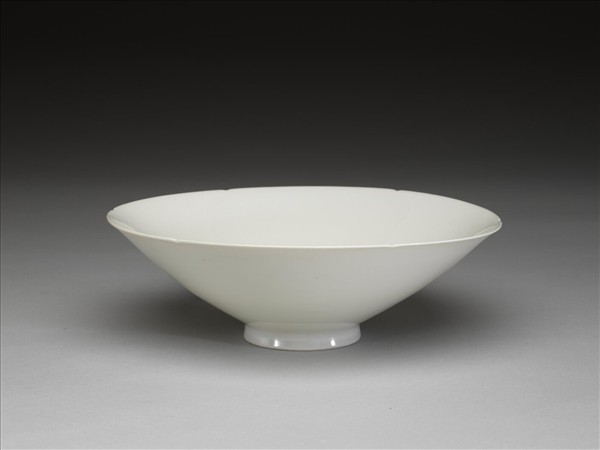 侈口,六瓣葵花形,深壁上豐下削,平底,矮圈足。內壁錐拱纏枝番蓮花,加飾八寶。半脫胎,甜白釉,花紋外面可見。碗心錐拱「永樂年製」四篆字暗款,外加雲頭紋邊。